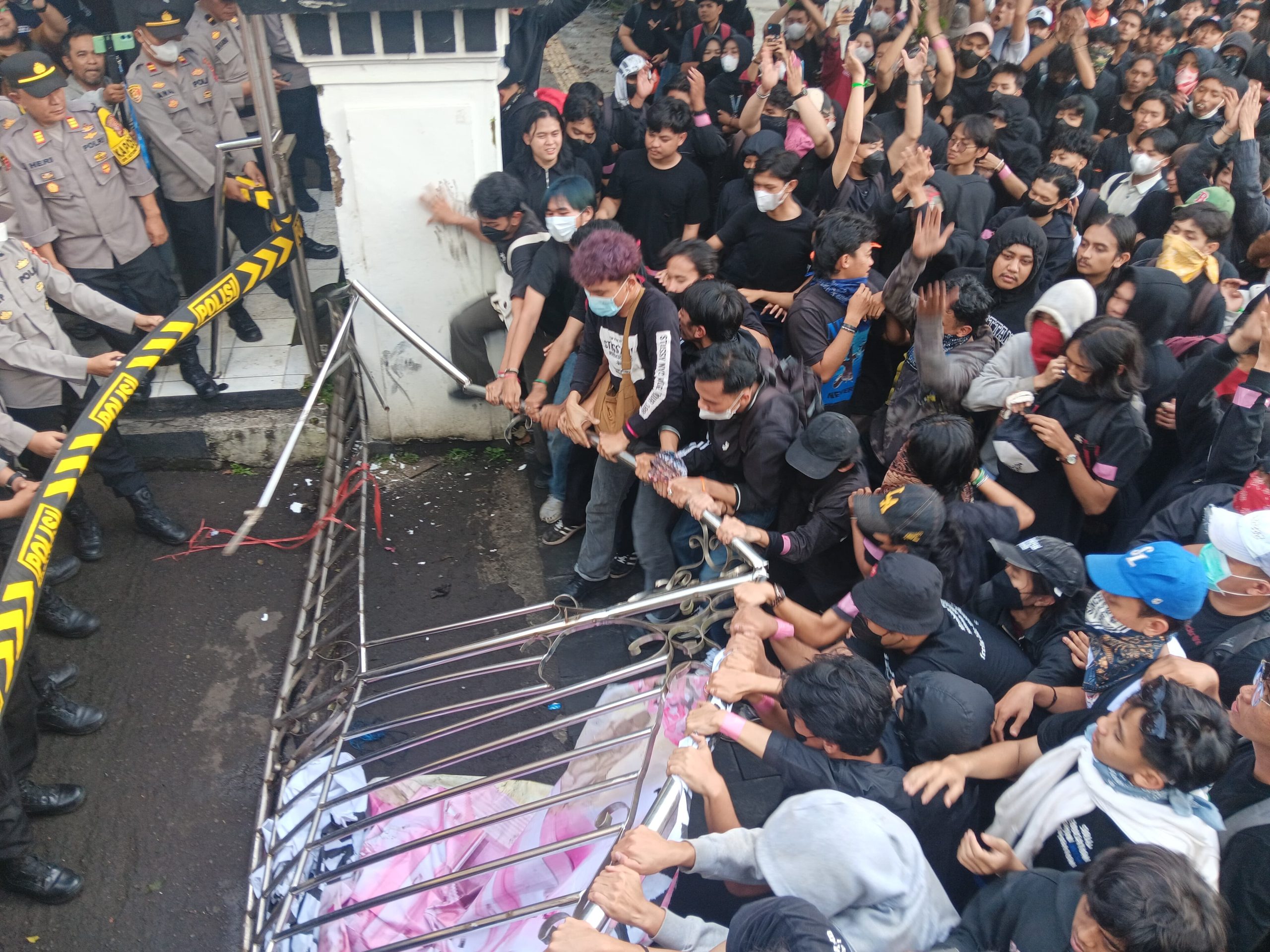 Sebelum rusuh, massa aksi yang terdiri dari mahasiswa dan elemen masyarakat berhasil merobohkan pagar bangunan Gedung DPRD Kota Sukabumi.
