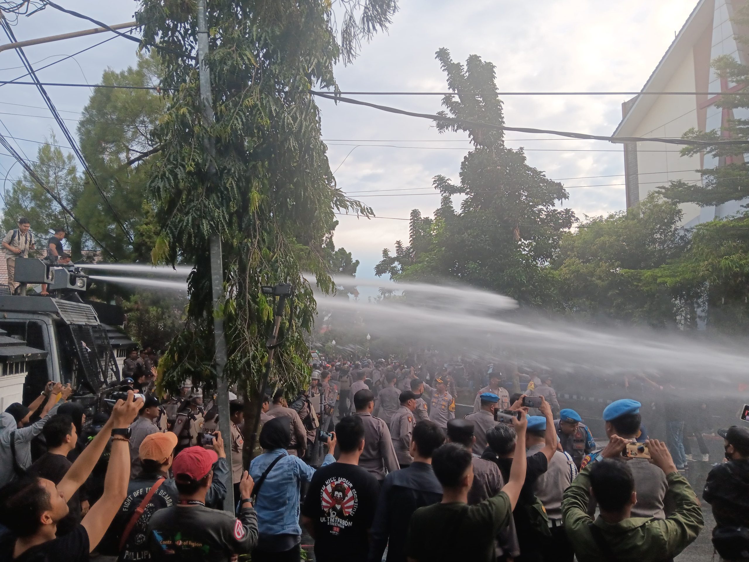 Di rasa situasi tidak bisa dikendalikan, tidak lama kemudian, polisi mencoba membubarkan massa dengan menyemprotkan air dari water canon sehingga massa bercerai-berai.