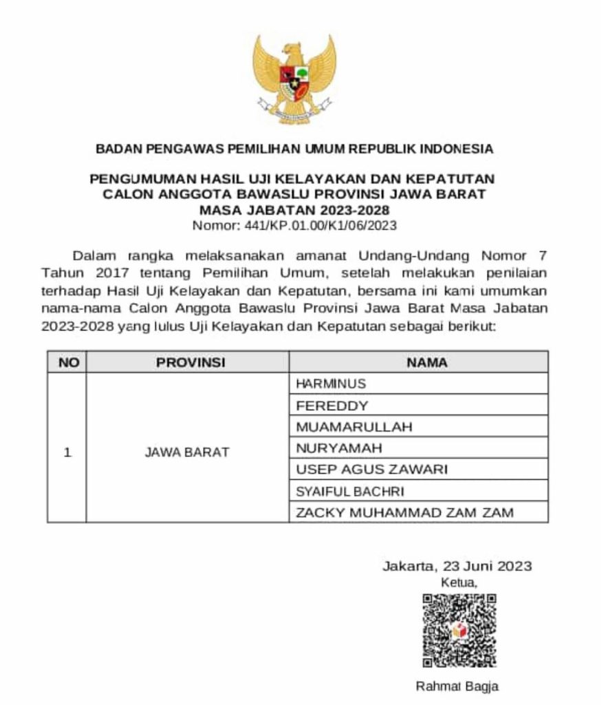 Dengan nomor surat pengumuman kelulusan : 441/KP.01.00/K1/06/2023 tentang Pengumuman Hasil Uji Kelayakan dan Kepatutan Calon Anggota Bawaslu Provinsi Jawa Barat masa jabatan 2023-2028.
