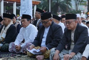 Bupati Sukabumi Marwan Hamami didampingi Wakil Bupati Iyos Somantri dan Sekda Ade Suryaman beserta unsur Forkopimda dan Masyarakat Palabuhanratu melaksanakan Salat Idul Fitri 1445 Hijrah, di Alun-alun Palabuhanratu, Rabu, (10/4/2024).