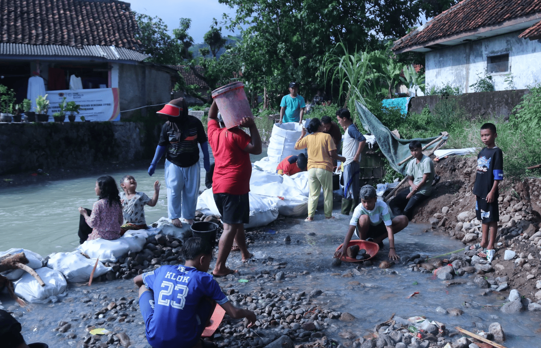 Warga bersama relawan tanggap dan sigap melakukan penanganan darurat, salah satunya dengan memasang beronjong di lokasi-lokasi rawan banjir.